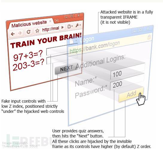 如以上示意圖的藍(lán)色層,攻擊者會(huì)通過一定的手段誘惑用戶“在紅色層”輸入信息,但用戶實(shí)際上實(shí)在藍(lán)色層中,以此做欺騙行為。
