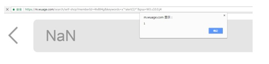黑客構(gòu)造一個包含XSS代碼的URL(服務(wù)器中沒有這樣的頁面和內(nèi)容),誘導(dǎo)或等待用戶去點(diǎn)擊鏈接,才能觸發(fā)XSS代碼,達(dá)到劫持訪問、獲取cookies的目的。一般容易出現(xiàn)在搜索頁面。 例如:https://m.wuage.com/search/self-shop?memberId=4lv8ll4g&keywords=x%22alert(1)%22&psa=M3.s10.0.j4 (此漏洞已經(jīng)修復(fù),請勿再測,造成訪問壓力。)