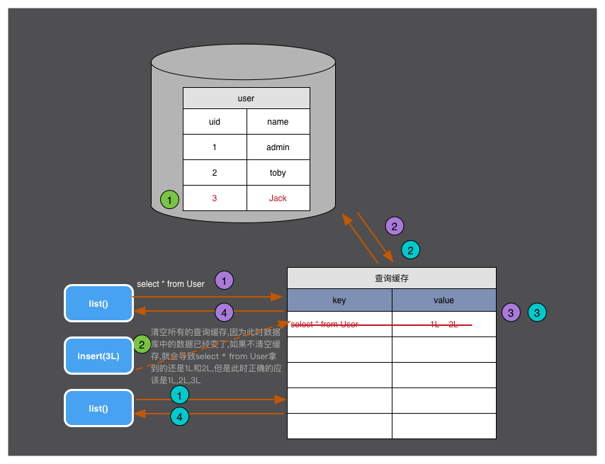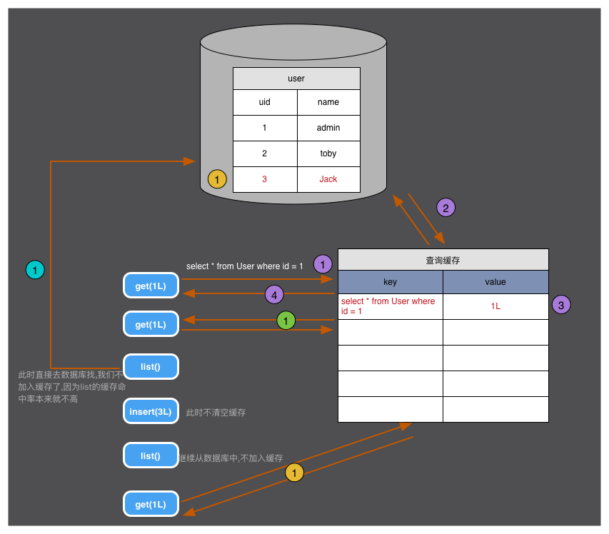 首先list()的時(shí)候,由于查詢緩存中沒(méi)有,那么我們?nèi)?shù)據(jù)庫(kù)查,并將數(shù)據(jù)放在了查詢緩存中,然后將結(jié)果返回