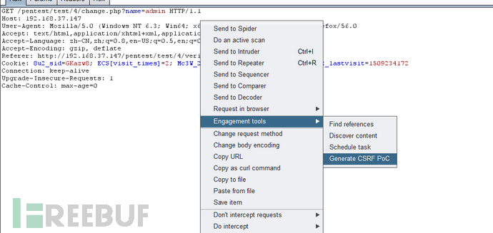 將更改密碼的請求用Burpsuite截獲 可一鍵生成CSRF PoC