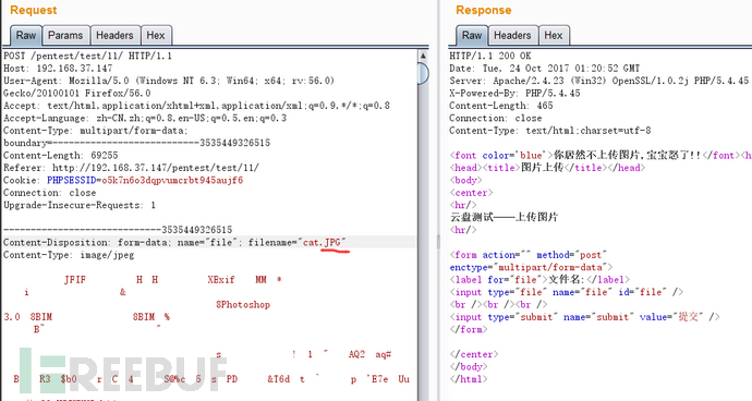 老樣子把上傳的數(shù)據(jù)包抓取下來分析 先傳了大寫的JPG 還是提示我不上傳圖片 后來改成小寫的就好了