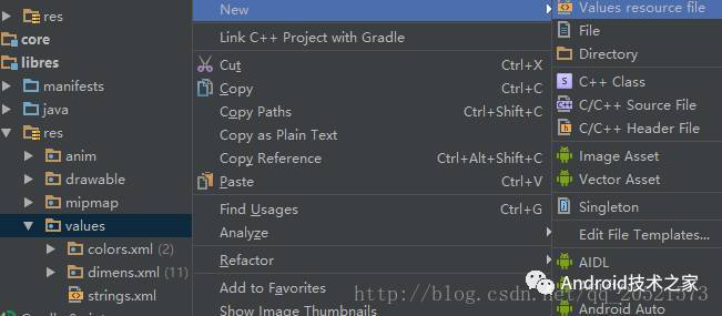 3.新建drawable-night和values-night的資源目錄。如果要適配不同分辨率的屏幕則可新建drawable-night-hdip、drawable-night-xhdpi等目錄來存放不同分辨率的圖片資源。values-night目錄下存放與夜間模式相關(guān)的value文件。本篇文章講解僅以夜間模式和日間模式的顏色為例,在values-night目錄下新建color.xml文件。