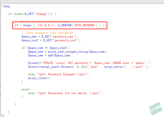 通過(guò)代碼可以看出比低級(jí)級(jí)別時(shí)多了if(eregi(“127.0.0.1“,$ SERVER('HTTP REFERER']))這一段代碼,eregi()函數(shù)是php中正則表達(dá)式,$_ SERVER()函數(shù)時(shí)取得服務(wù)器和環(huán)境信息,這段代碼的目的是匹配服務(wù)器信息中HTTP_REFERER地址是否存在127.0.0.1這個(gè)IP地址.目的是為了驗(yàn)證頭部referer請(qǐng)求源。