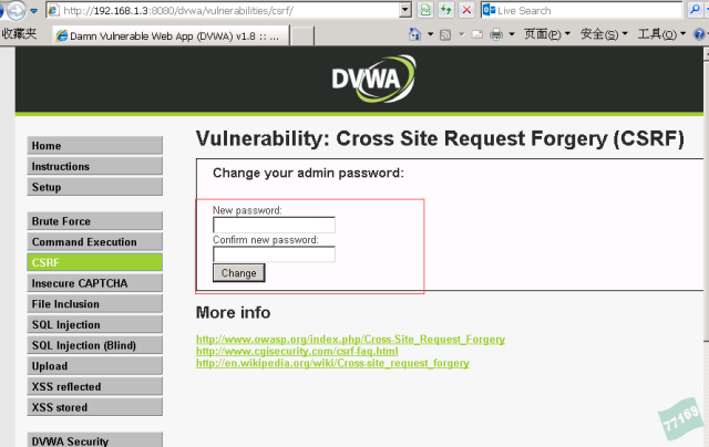 去,將網(wǎng)站的安全級(jí)別調(diào)整到最低,調(diào)整完畢后進(jìn)入CSRF頁(yè)面之中。