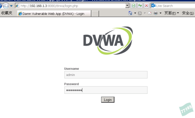 在這里我搭建了一個(gè)DWVA的網(wǎng)站,輸入用戶名和密碼登陸進(jìn)