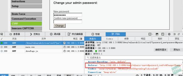 使用F12鍵調(diào)用控制臺(tái)中的網(wǎng)絡(luò)選項(xiàng),再修改一次密碼查看他的cookie信息找到剛才提到的referer字段,發(fā)現(xiàn)沒(méi)有127.0.0.1這個(gè)ip,所以我們的修改是無(wú)效的。