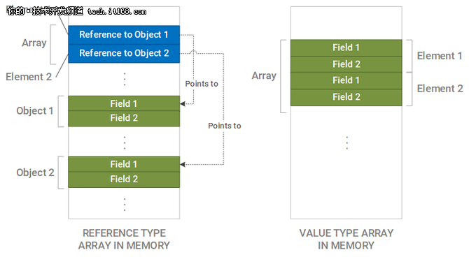 將數(shù)據(jù)直接放在內(nèi)存中(而不是參考)被稱為扁平化,其優(yōu)點在數(shù)組中更為明顯。在對象數(shù)組的情況下,數(shù)組中的每個元素都存儲對與該元素關(guān)聯(lián)的對象的引用,要求在訪問對象之前執(zhí)行取消引用。在值類型的數(shù)組中,值直接放置在數(shù)組中,并保證在連續(xù)的內(nèi)存中。這個想法如下圖所示: