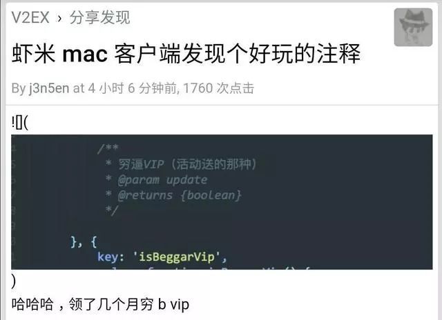 11 月 19 日,在 V2EX 社區(qū)的技術(shù)版一名網(wǎng)友發(fā)布了一篇名為《蝦米 mac 客戶端發(fā)現(xiàn)個好玩的注釋》的帖子,文中貼出了阿里巴巴旗下蝦米音樂 Mac 版客戶端的代碼,其中負責該項目的程序員為了讓同事看懂這串代碼,由此對該段的代碼注釋為“窮逼 VIP(活動送的那種)”,帖子一出引發(fā)了眾多網(wǎng)友的爭議。