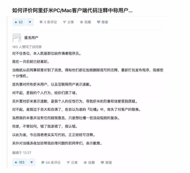 11 月 20 日,蝦米音樂 App 前員工八座在知乎更新評論,“對不住各位,本人就是那位始作俑者程序員。今后我老老實實寫代碼,正正經(jīng)經(jīng)寫注釋”。他說,在自以為是的“吐槽”中喪失了對客戶的敬畏,對所有蝦米用戶,以及互聯(lián)網(wǎng)用戶表示道歉。