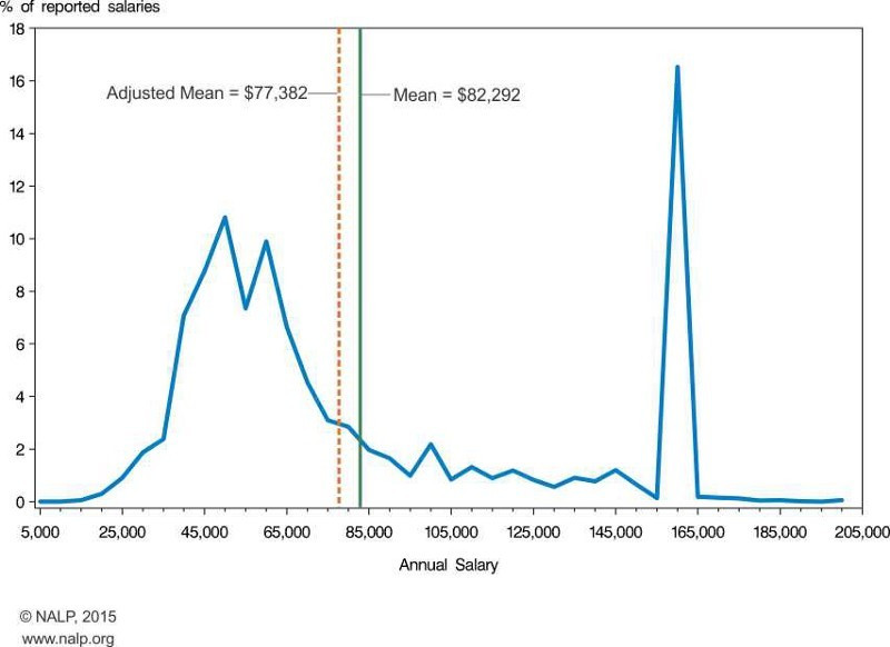 更成熟的專業(yè)領(lǐng)域往往會有雙峰的工資分布模式:相對較少的從業(yè)人員賺走了相當多的錢,其中大多數(shù)人的工資都不錯,但并沒有處在前1%之列。美國全國法律就業(yè)組織收集的數(shù)據(jù)可以十分清晰地反映出這一現(xiàn)象。大部分法學(xué)畢業(yè)生的工資在45000美元到65000美元之間,這是很高的工資了,但很難跟“頂尖專業(yè)人士”聯(lián)系在一起。