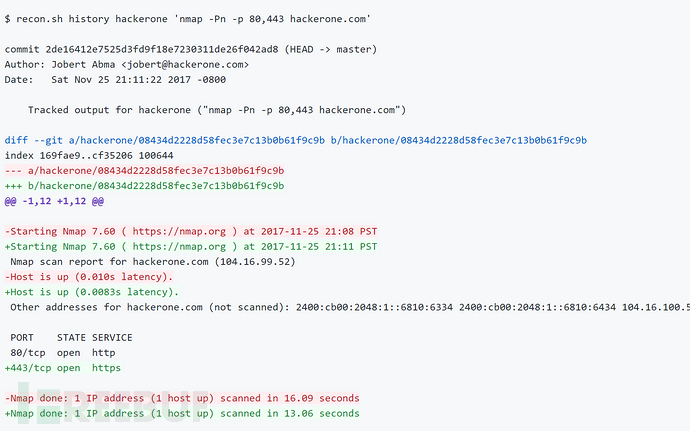 recon.sh track hackerone 'nmap -Pn -p80,443 hackerone.com' Starting Nmap 7.60 ( https://nmap.org ) at2017-11-25 20:52 PST Nmap scan report for hackerone.com(104.16.99.52) Host is up (0.0089s latency). PORT STATE SERVICE 80/tcp open http 443/tcp open https Nmap done: 1 IP address (1 host up) scannedin 13.09 seconds [master fc557ea] Tracked output forhackerone ("nmap -Pn -p 80,443 hackerone.com") 1file changed, 1 insertion(+) create mode 100644hackerone/08434d2228d58fec3e7c13b0b61f9c9b