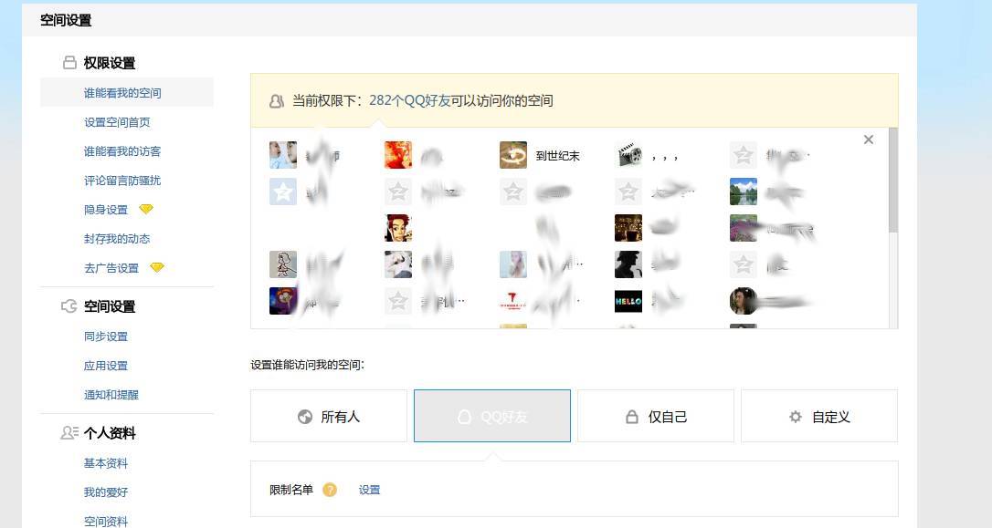 研究好久后發(fā)現(xiàn)在QQ空間主頁中權(quán)限設(shè)置頁面中,點(diǎn)擊僅限QQ好友,會(huì)有下面這樣的頁面出來