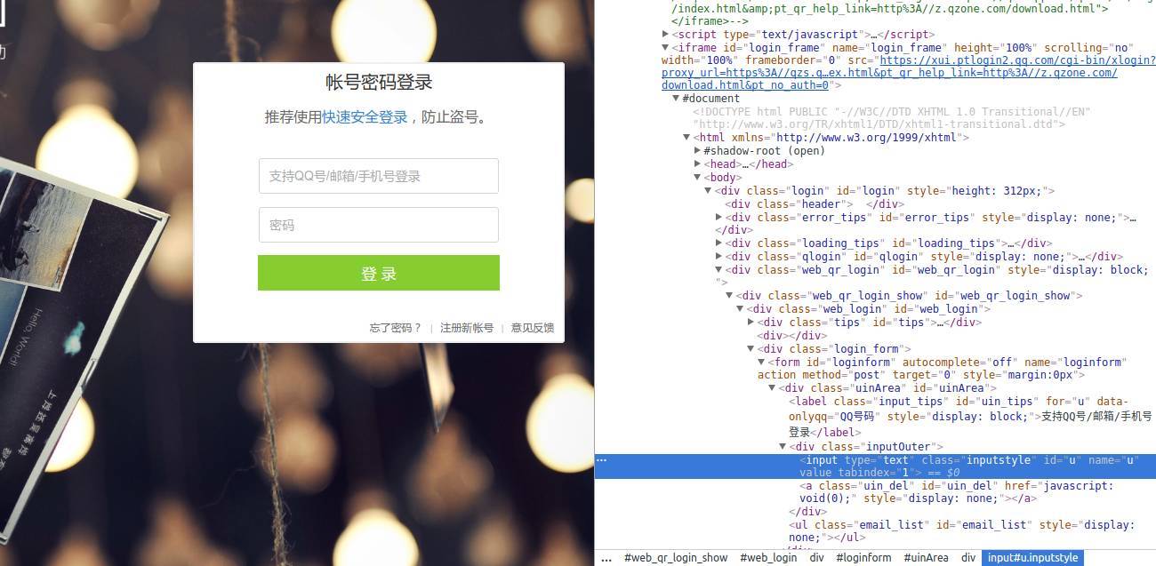 deflogin(self):self.web.switch_to_frame( 'login_frame') log= self.web.find_element_by_id( "switcher_plogin") log.click() time.sleep( 1) username= self.web.find_element_by_id( 'u') username.send_keys( self.__username) ps= self.web.find_element_by_id( 'p') ps.send_keys( self.__password) btn= self.web.find_element_by_id( 'login_button') time.sleep( 1) btn.click() time.sleep( 2)