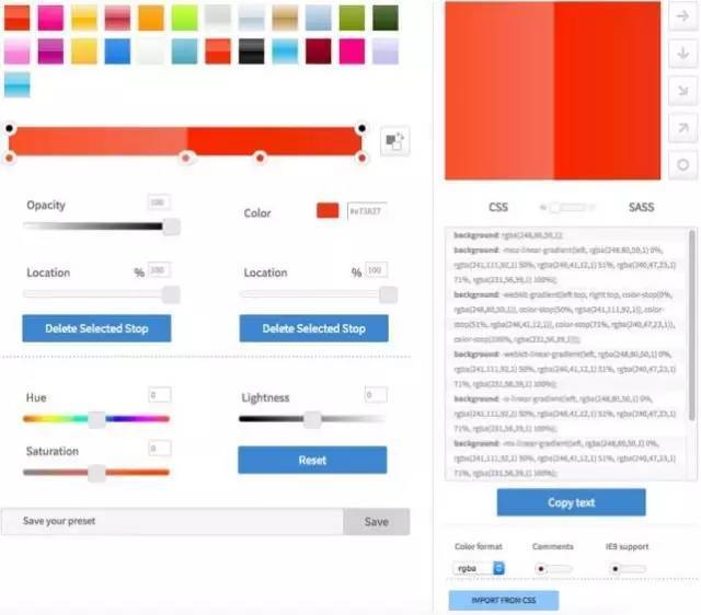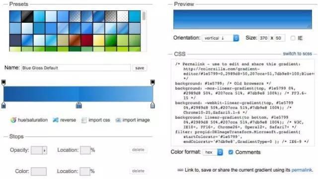 這是一個(gè)完全免費(fèi)的工具,而且擁有類似Photoshop一樣的視覺編輯器,可以生成漸變代碼。你可以通過在漸變箱中移動(dòng)滑塊的方式來改變色彩位置,并且生成CSS代碼。你也可以用它在漸變中添加或是移除顏色,并且改變方向。