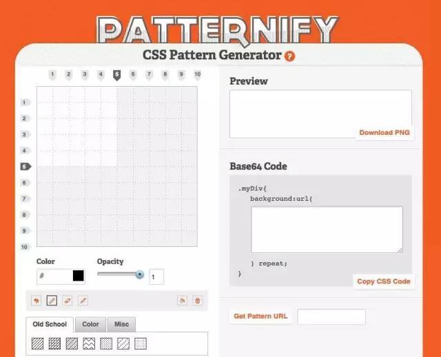 它的模式設(shè)計(jì)接口不是很多,但是它卻是一個(gè)pixel-by-pixel生成器。因此,如果你想要一個(gè)噪音模式,你可能需要用其他一些工具。但是Patternify卻可以自動(dòng)輸出圖像URL,并且為你提供base64代碼,你可以將其復(fù)制/剪切到你的CSS中。