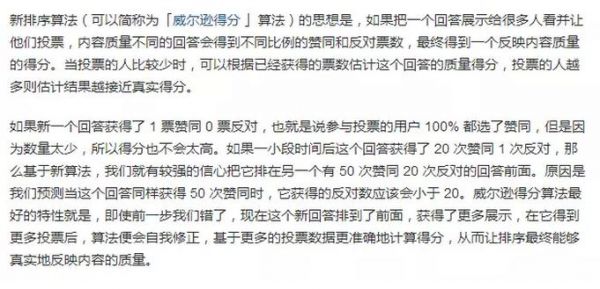 我們?cè)谥踅?jīng)常會(huì)看到有的答案有幾萬(wàn)的贊竟然排在幾百贊答案的后面,這個(gè)就是知乎區(qū)別于傳統(tǒng)的論壇、貼吧單純的根據(jù)發(fā)布時(shí)間或者點(diǎn)贊數(shù)來(lái)排名的特殊機(jī)制,那么這個(gè)機(jī)制就讓時(shí)間比較晚的優(yōu)質(zhì)回答有了更多的曝光的機(jī)會(huì),那么具體知乎這個(gè)排名算法是在怎么計(jì)算的呢?這個(gè)算法被叫做威爾遜算法,公式的話(huà)太復(fù)雜這里不說(shuō),只是說(shuō)一下他是怎樣運(yùn)作的。