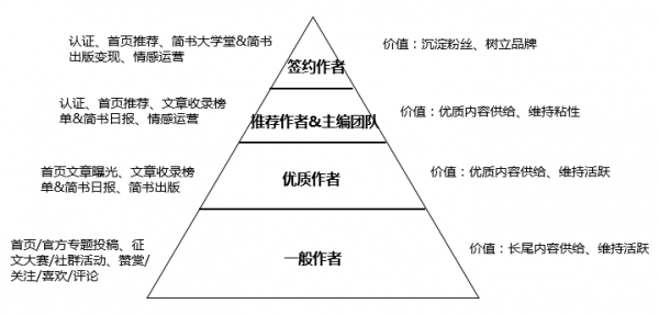 簡書的內(nèi)容生產(chǎn)者用戶分層,從【簽約作者-推薦作者&主編團(tuán)隊-優(yōu)質(zhì)作者-一般作者】提供了針對性的運營策略,并結(jié)合平臺資源,對用戶進(jìn)行了“上升通道”建設(shè)。