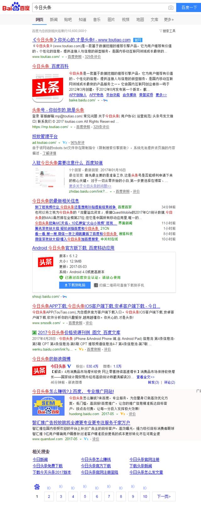 還是以“今日頭條”這個詞為例,第一頁的網(wǎng)站是今日頭條官方網(wǎng)站,百度百科對這個詞的解釋,百度應用的頭條APP下載,百度文庫,今日頭條官方微博等。那么如果我們要優(yōu)化這個詞,就是要超越這些網(wǎng)頁,其難度可想而知。