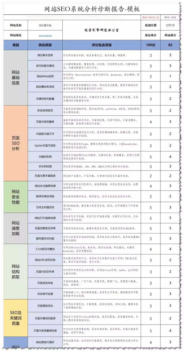 以上是最常見的SEO的基礎(chǔ)優(yōu)化,影響網(wǎng)站關(guān)鍵詞排名的因素非常的多,必須學(xué)會(huì)對(duì)網(wǎng)站進(jìn)行分析,對(duì)網(wǎng)站日志,爬蟲日志都要有所了解,這樣優(yōu)化網(wǎng)站排名自然不會(huì)差,下面是一份《網(wǎng)站SEO診斷打分表》,在編寫合格的優(yōu)化方案的時(shí)候,可以參考使用。